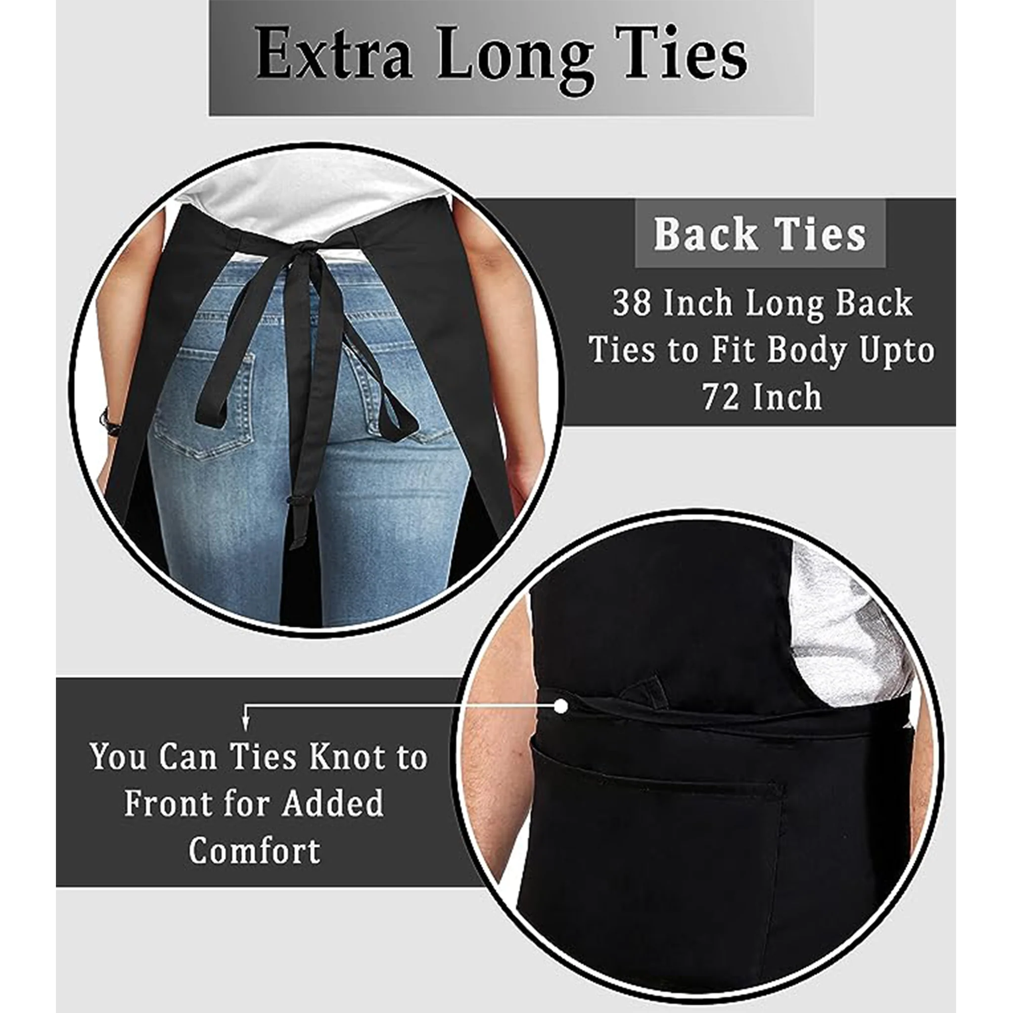- Key Features: It has adjustable neck strap & ties 28 Inches, 5 Pockets. Aprons can be easily altered to fit most individuals and provides bigger & better coverage. Each apron is 34 Inches long & 28 Inch Wide. XXL Size Apron has 38 Inch Long Back Ties made to fit any body size up to 72 Inches. Back ties can also be wrapped/tied in front or back.