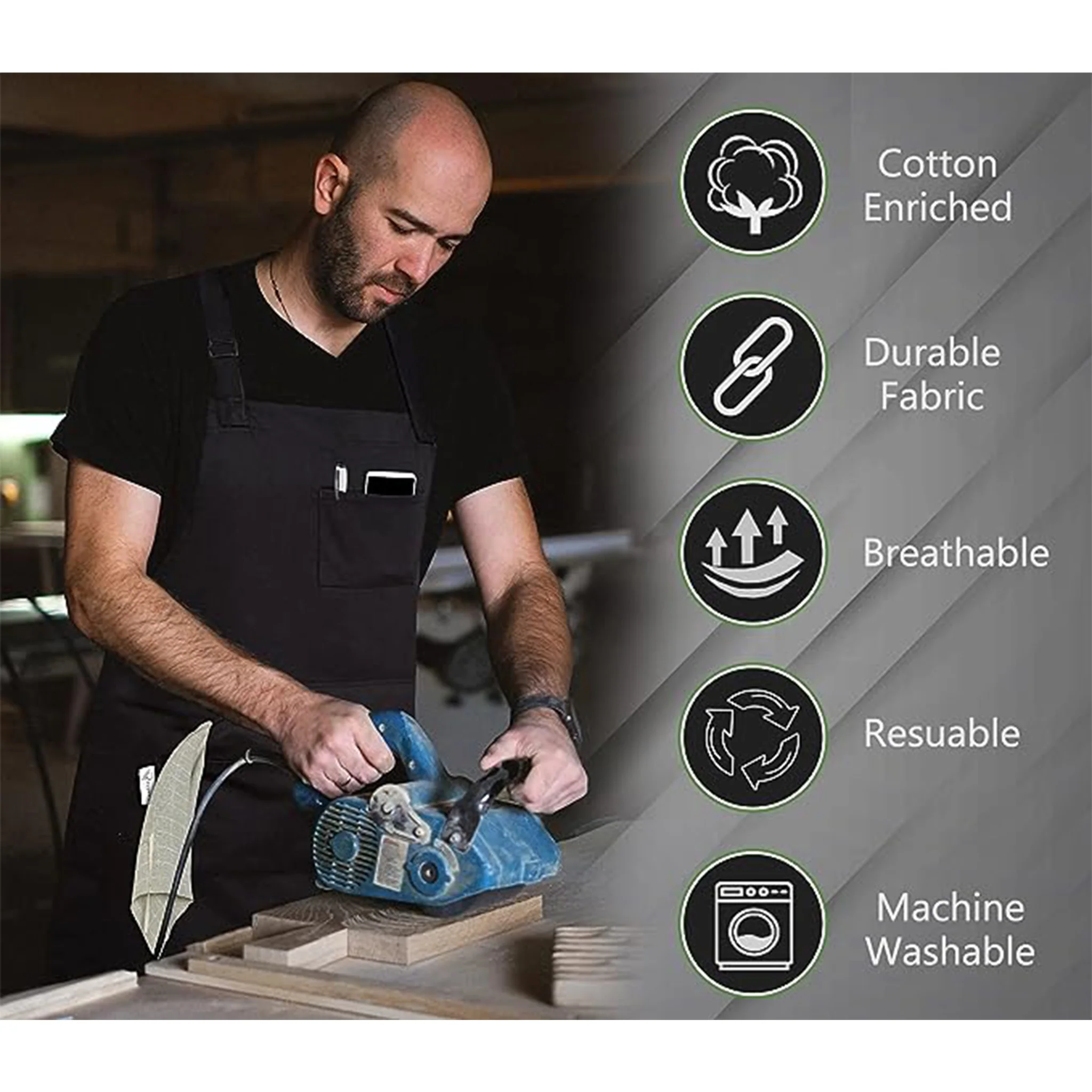 - Durable & Comfortable Fabric: 1 Pack Black Aprons for Men are made with Cotton Enrich Durable Fabric which is Washable, Fade-Proof, Wrinkle, Shrinkage Resistant. Our Work Aprons are water drop resistant and protect your clothes from oil spills, Stains & Dirt. It is Designed to hold tools while doing work and gives a relax, comfortable feeling while Cooking, Baking, Woodworking, Gardening and other professional tasks.