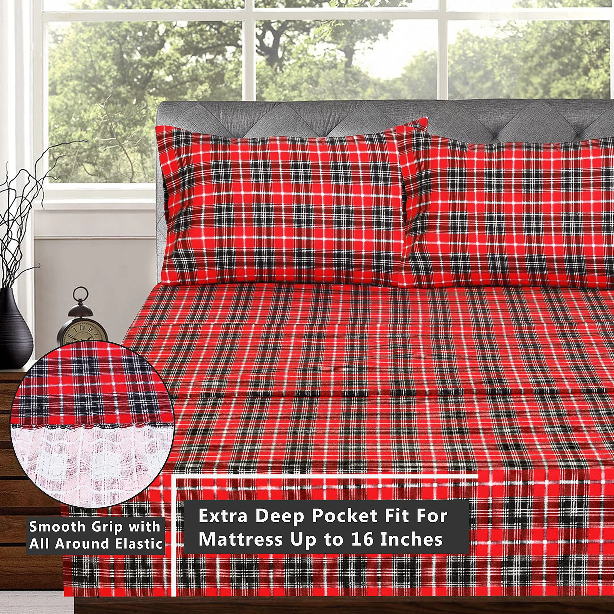 Ruvanti Stripe & Plaid 100% Cotton Flannel Sheets Set – Ultra Soft, Warm & Breathable Bed Sheets, Deep Pocket, Double Brushed All-Season Cozy Bedding, 4 Piece Set