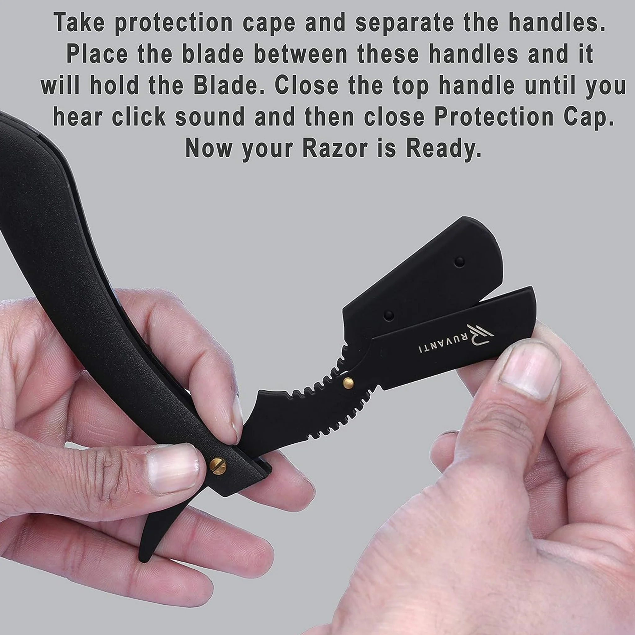 Ruvanti handmade light weight straight edge razor is designed for professional barbers as well as for beginners for safe, comfortable, fine & smooth Men's shave. This Straight Edge Black Razor is made of stainless steel with premium quality with quoting of matte which keep the razor away from rust. The razor is beautifully crafted for smooth hand grip and easy to open for comfortably exchange of blades. This razor have smooth & comfortable adjustment flip which help to adjust the blade for close shave. Take the protection cape to separate the handles and place the blade between these handles. Close the top handle until you hear a click sound and then also close protection cap, thereafter your razor will be read for shave.
