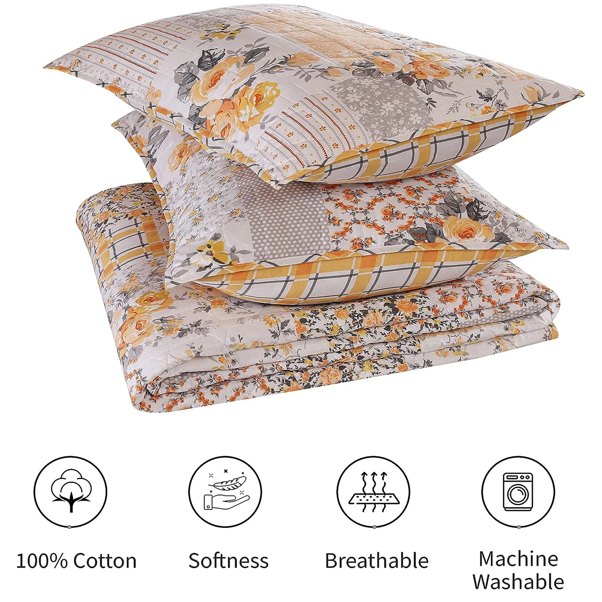 The Ruvanti Quilt Bedding Set is crafted with upper and lower layers made of 100% premium cotton soft fabric, while the inside filling consists of 80% cotton and 20% polyester, providing a cozy and warm feel. The quilt is nicely stitched to keep the filling layer smooth and in place. The set features a reversible floral design fabric that adds a touch of fashion and dimension to your bedroom, guest room, kids room, hotel, or even camping. The fabric undergoes a unique process of pre-washing and pre-shrinking, ensuring that it is smell-free and resistant to shrinkage. This process also enhances its softness and makes it more skin-friendly. Drift off to sweet and cozy dreams by layering your bed with this warm and comfortable king-size quilt bedding set. The set includes coordinating pillow shams that blend well with any bedroom decor.Taking care of this oversized king quilt is easy, as it is machine washable with cold water in a gentle cycle. We have created our products with adoration and care, and we offer a 100% money-back guarantee upon a single email request.