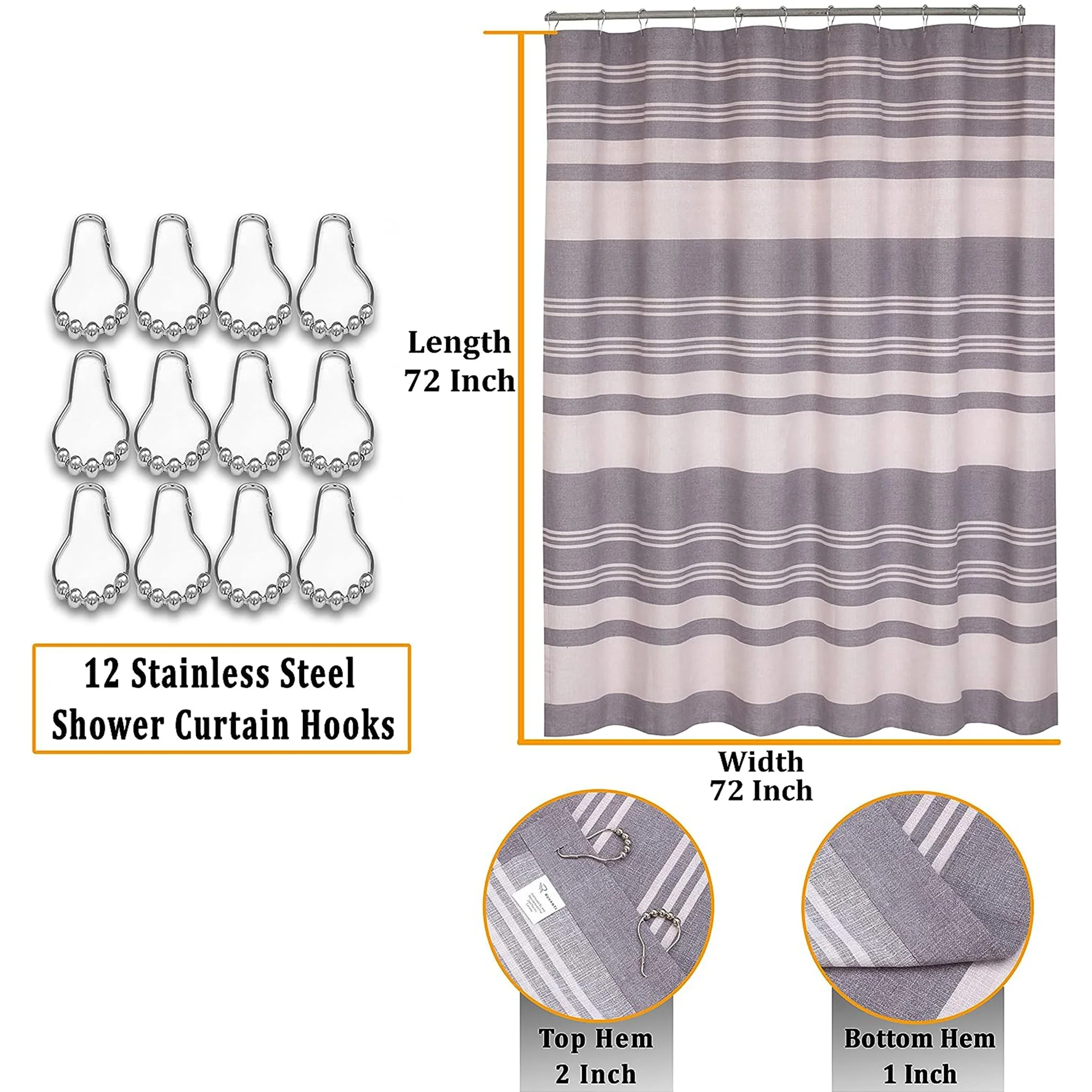Water Resistant Bathroom Shower Curtain by Ruvanti (72x72 Inch) - Aspid Grey Stripe (With Hooks)